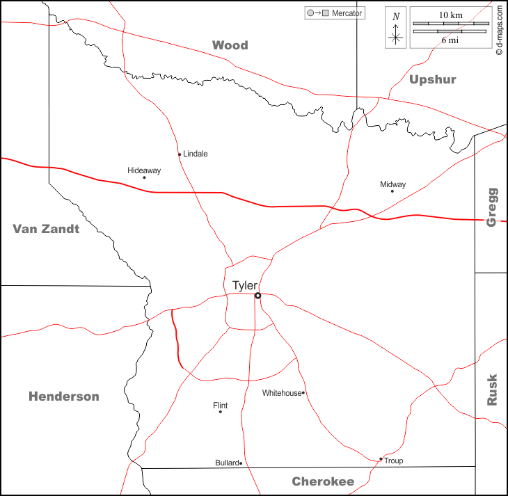 d-maps > United States of America (USA) > Texas > Smith County > boundaries, main cities, roads, names, white