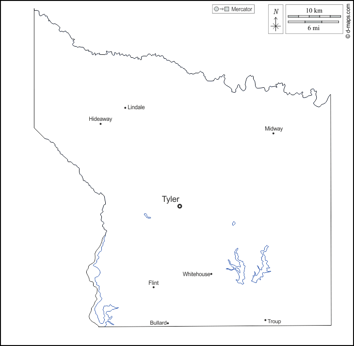 d-maps > United States of America (USA) > Texas > Smith County > outline, hydrography, main cities, names, white