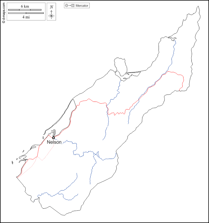 d-maps > Oceania > Nelson > outline, hydrography, main cities, roads, names, white