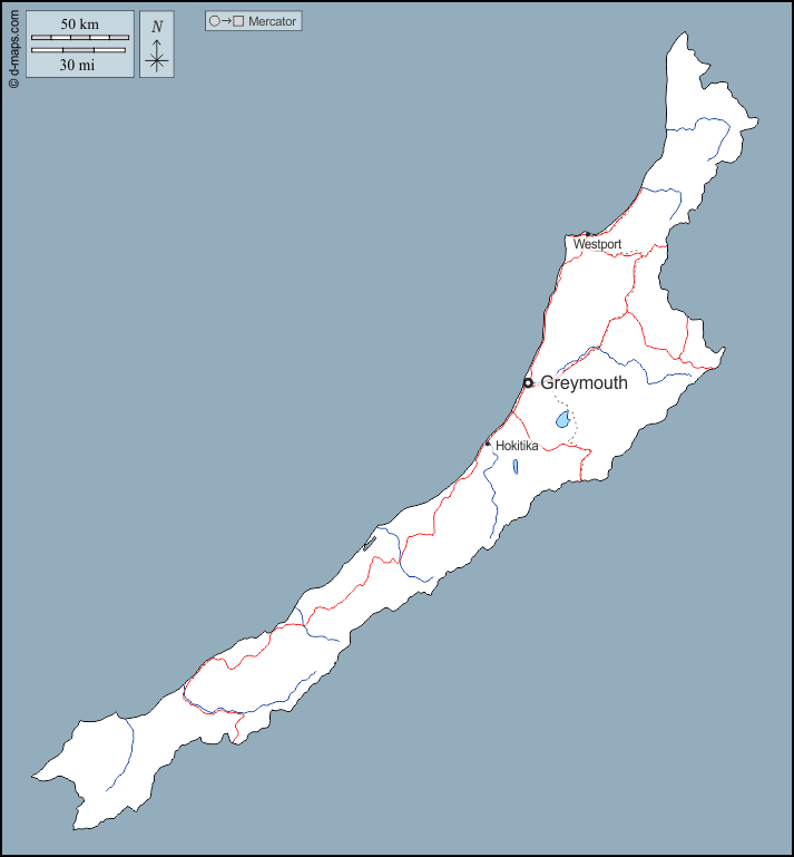 d-maps > Oceania > West Coast > outline, hydrography, main cities, roads, names