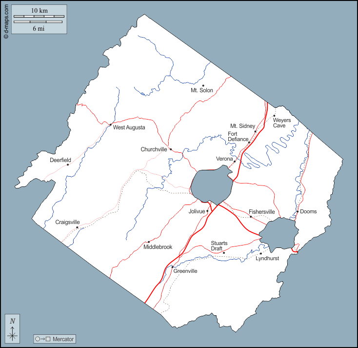 d-maps > Estados Unidos de América (USA) > Virginia > Condado de Augusta > contornos, hidrografía, principales ciudades, carreteras, nombres