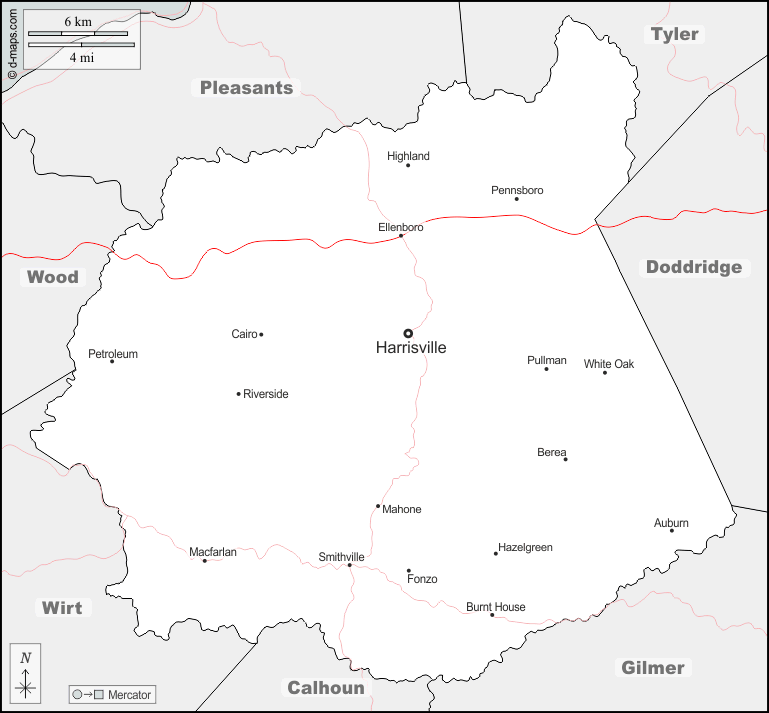 d-maps > Estados Unidos de América (USA) > Virginia Occidental > Condado de Ritchie > fronteras, principales ciudades, carreteras, nombres