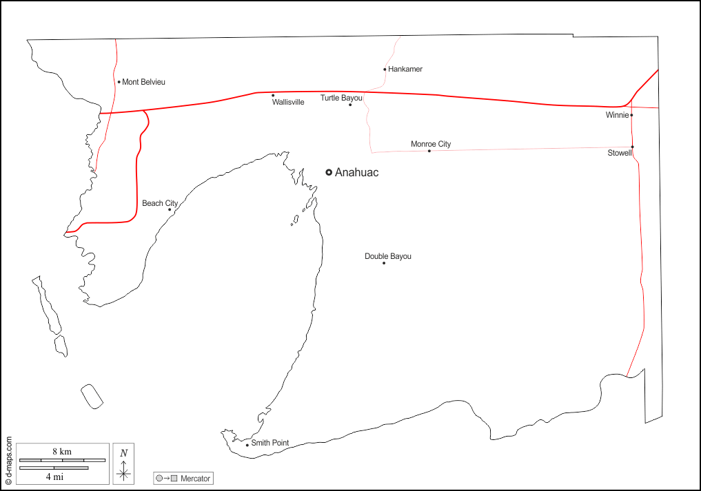 d-maps > Estados Unidos de América (USA) > Texas > Condado de Chambers > contornos, principales ciudades, carreteras, nombres, blanco
