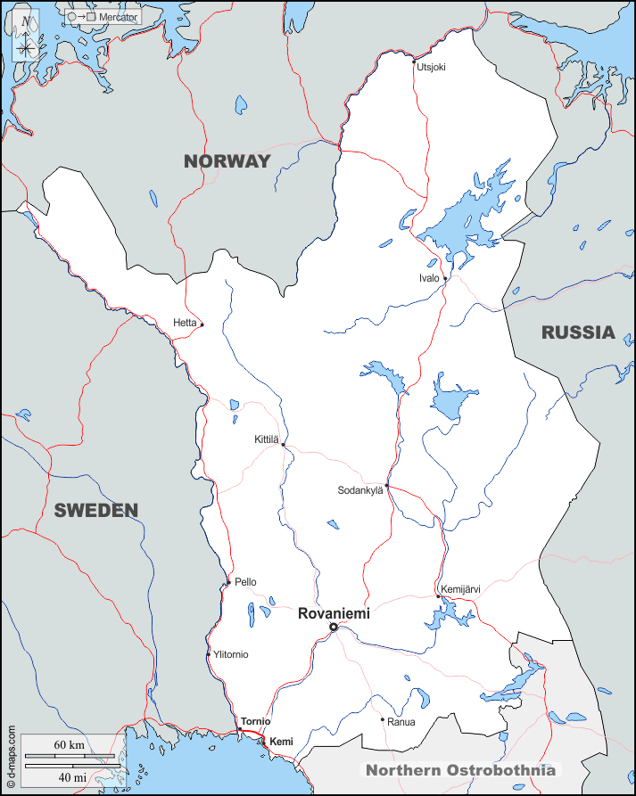 d-maps > Europa > Finlandia > Laponia > fronteras, hidrografía, principales ciudades, carreteras, nombres