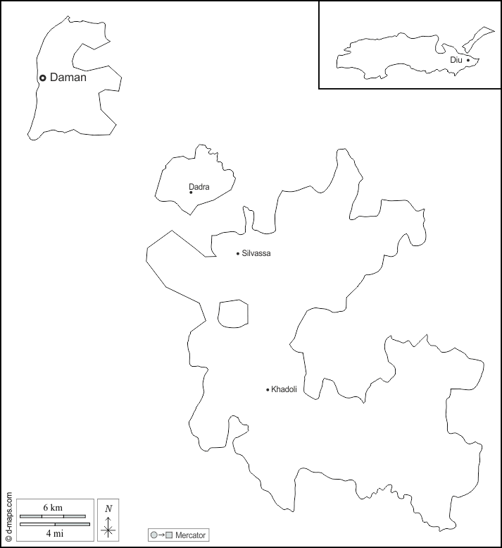 d-maps > Asia > India > Dadra y Nagar Haveli y Damán y Diu > contornos, principales ciudades, nombres, blanco