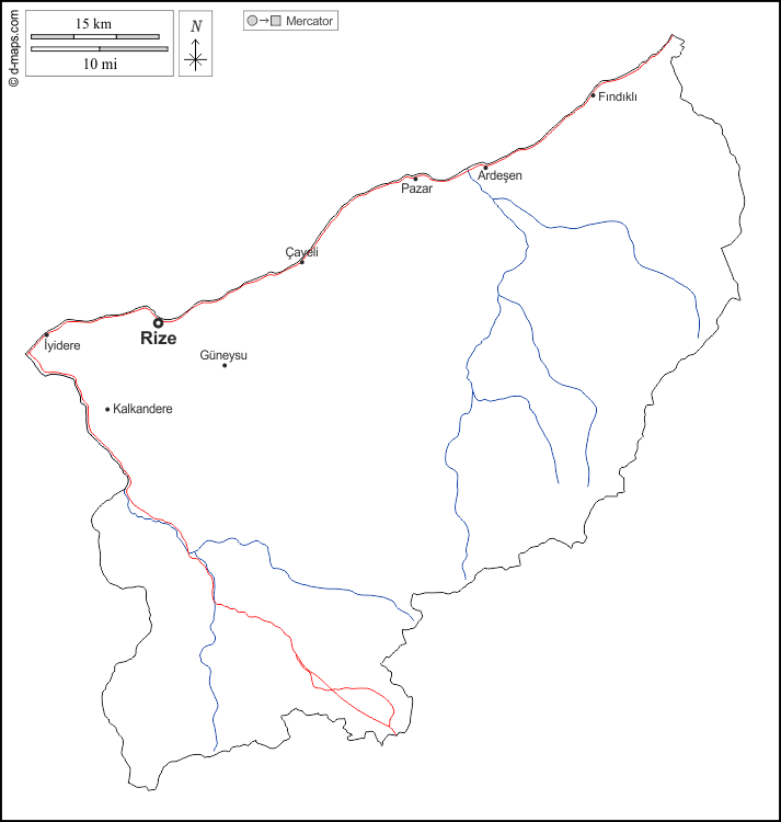 d-maps > Asia > Turquía > Rize > contornos, hidrografía, principales ciudades, carreteras, nombres, blanco