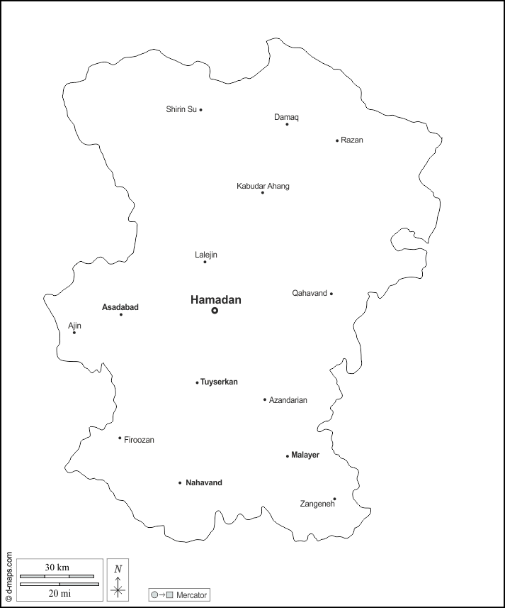 d-maps > Asia > Irán > Hamadan > contornos, principales ciudades, nombres, blanco