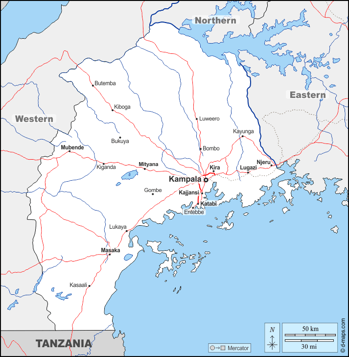 d-maps > África > Uganda > Central > fronteras, hidrografía, principales ciudades, carreteras, nombres