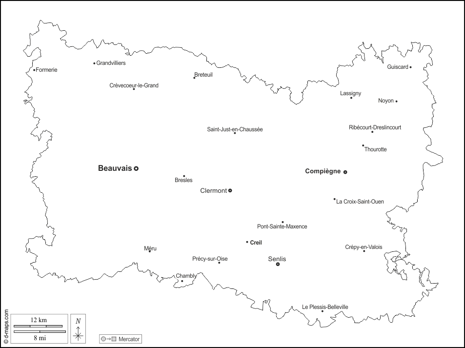 d-maps > Europe > France > Oise > contours, principales villes, noms, blanc