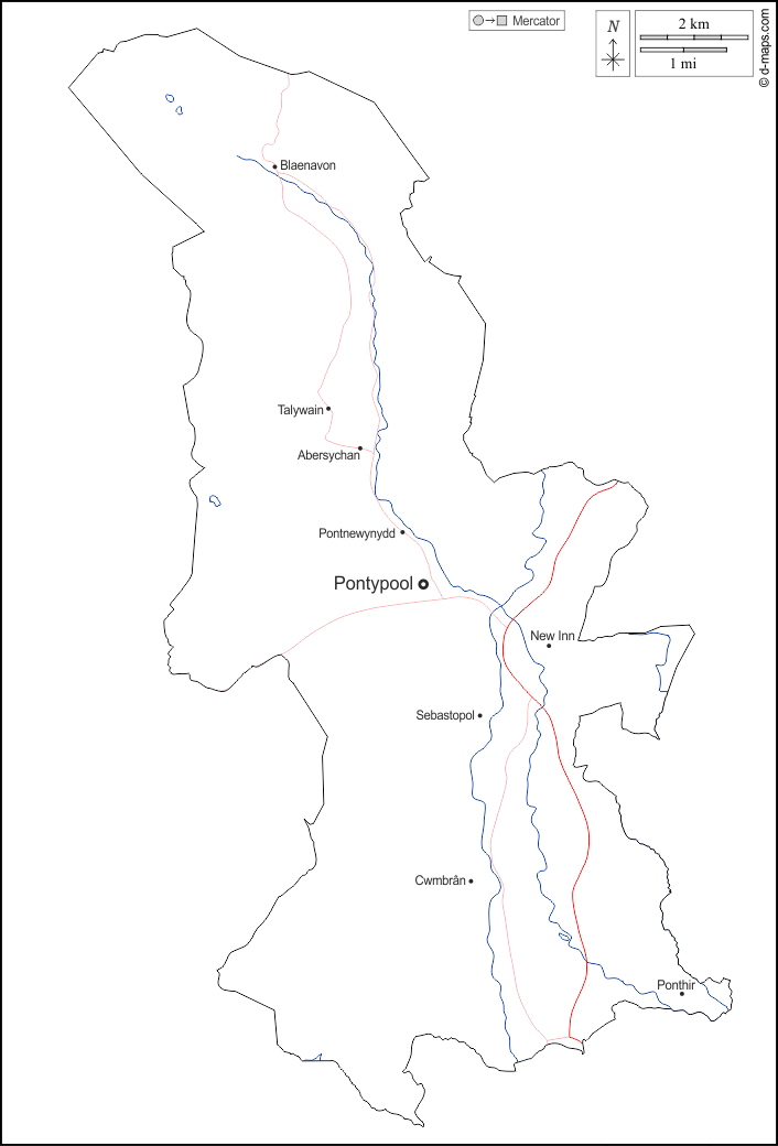 d-maps > Europe > Royaume Uni > Torfaen > contours, hydrographie, principales villes, routes, noms, blanc