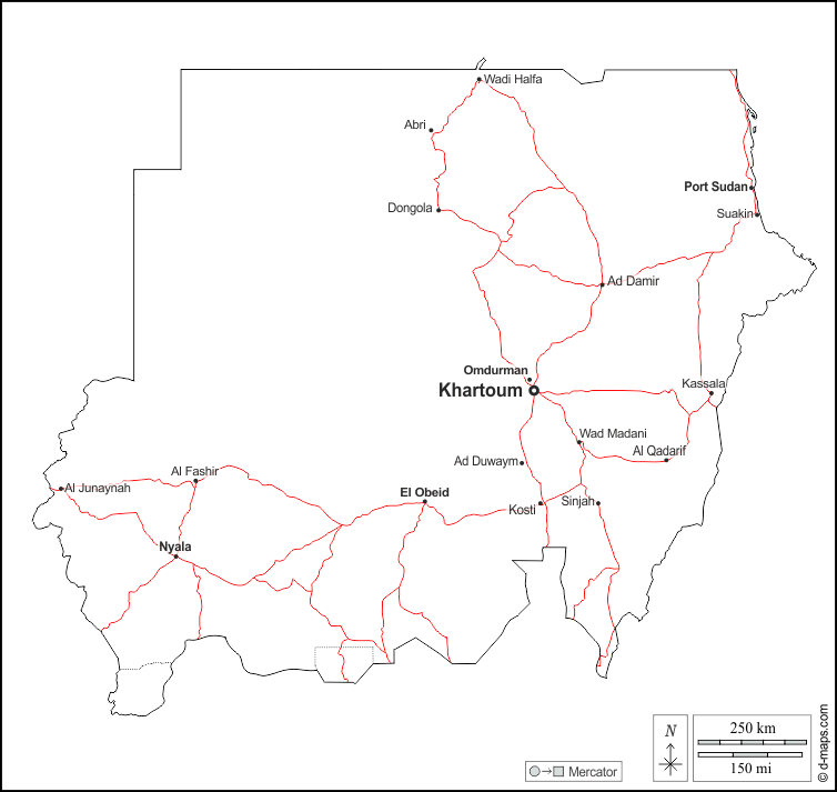 d-maps > Afrique > Soudan > Soudan > contours, principales villes, routes, noms, blanc