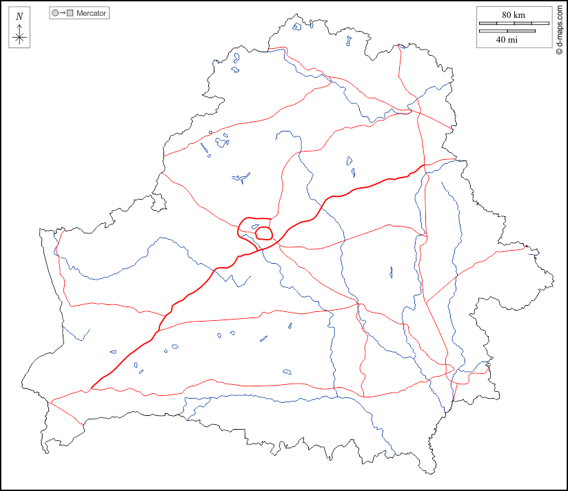 d-maps > Europe > Biélorussie (Belarus) > Biélorussie (Belarus) > contours, hydrographie, routes, blanc
