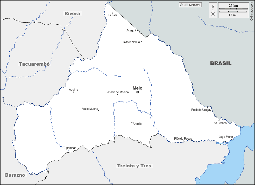 d-maps > Amériques > Uruguay > Cerro Largo > frontières, hydrographie, principales villes, noms