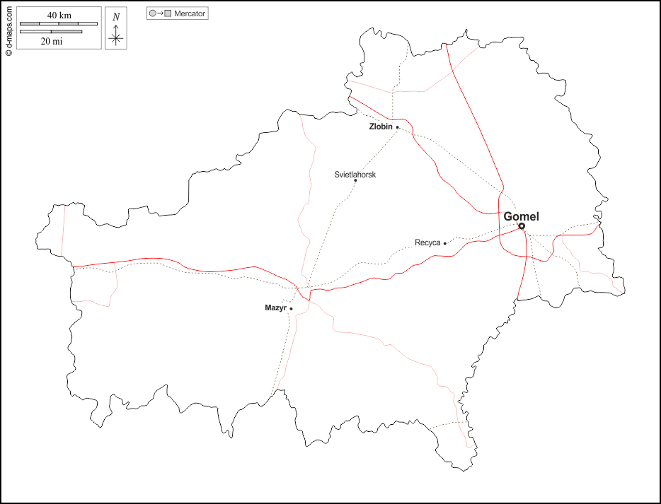 d-maps > Europe > Biélorussie (Belarus) > Voblast de Homiel > contours, principales villes, routes, noms, blanc
