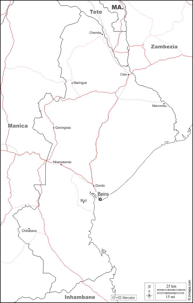 d-maps > Afrique > Mozambique > Sofala > frontières, principales villes, routes, noms, blanc