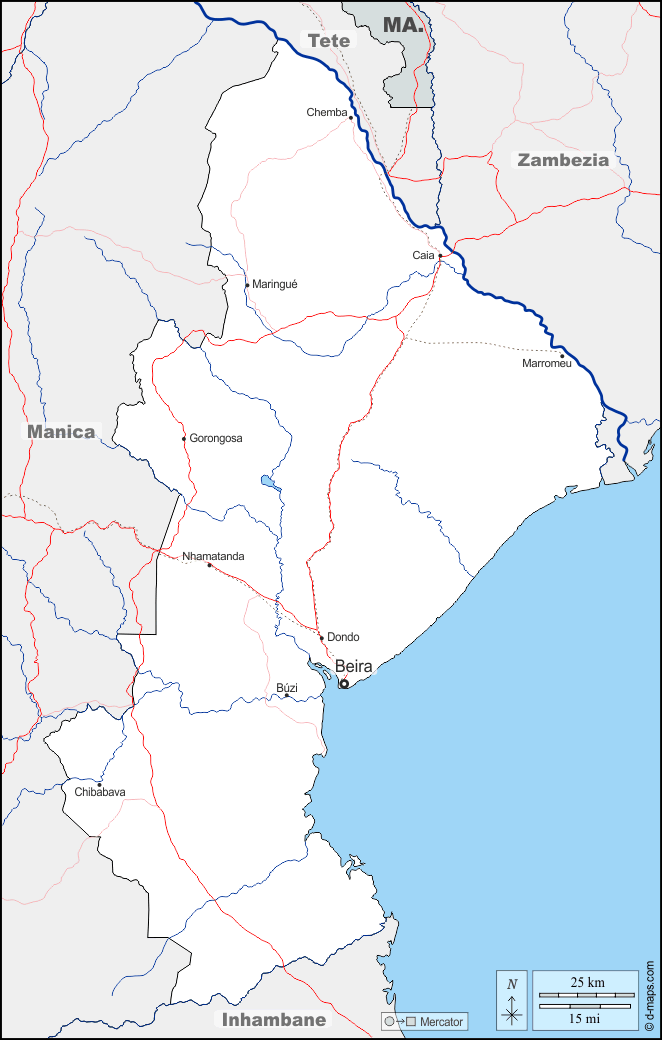 d-maps > Afrique > Mozambique > Sofala > frontières, hydrographie, principales villes, routes, noms