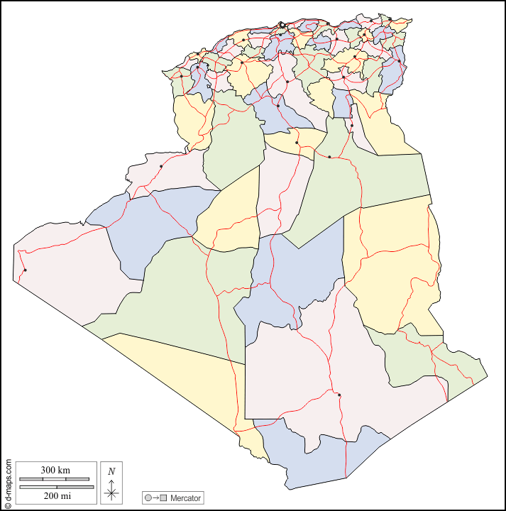 d-maps > Afrique > Algérie > Algérie > contours, wilayas, principales villes, routes, couleur, blanc