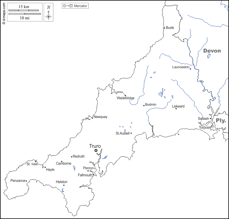 d-maps > Europe > Royaume Uni > Cornwall > frontières, hydrographie, principales villes, noms, blanc
