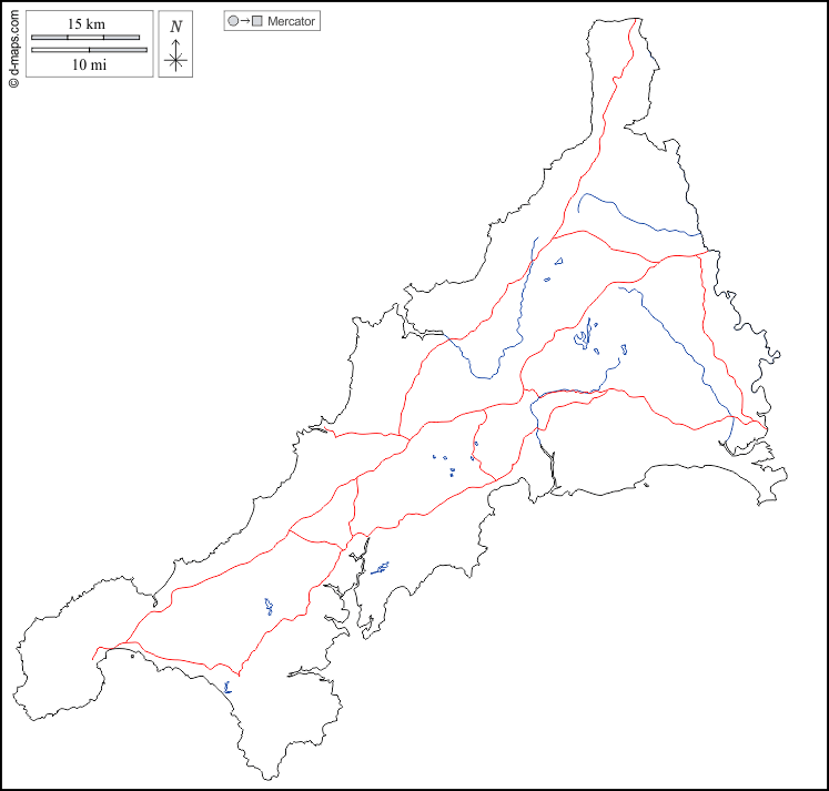 d-maps > Europe > Royaume Uni > Cornwall > contours, hydrographie, routes, blanc