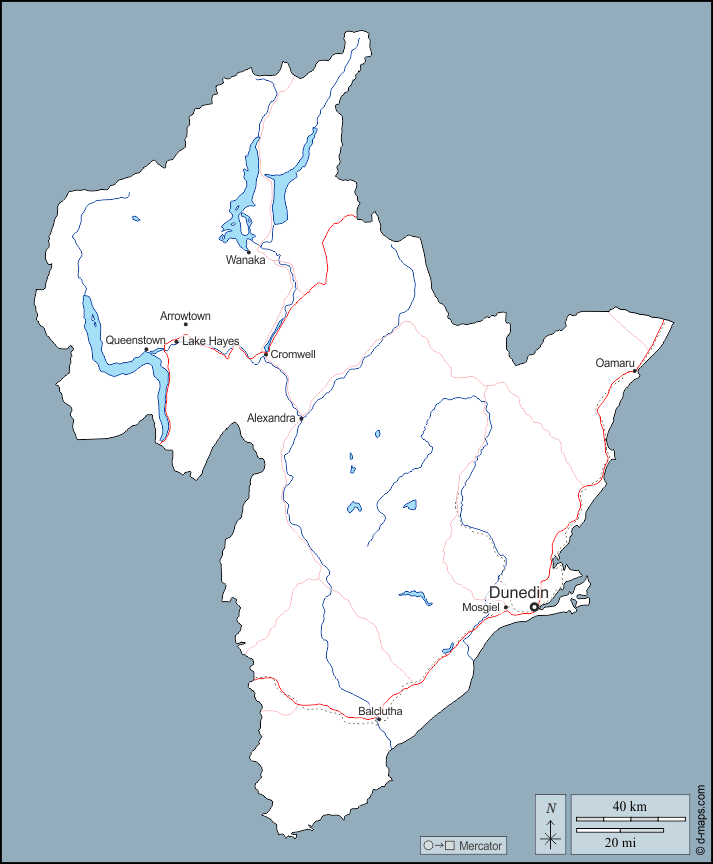 d-maps > Océanie > Otago > contours, hydrographie, principales villes, routes, noms