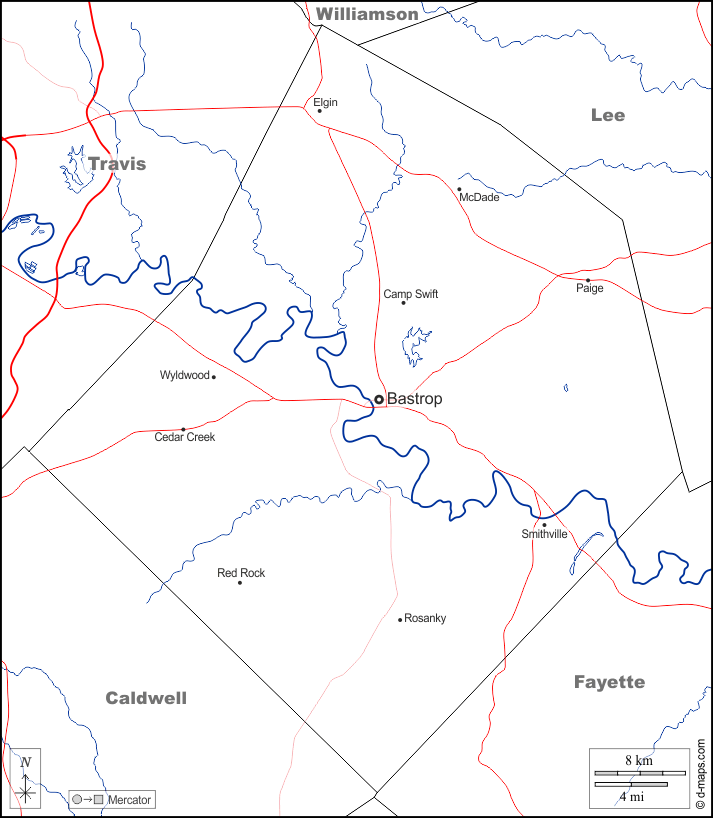 d-maps > संयुक्त राज्य > टेक्सास > बास्ट्रोप काउंटी > सीमाओं, जल-सर्वेक्षण, मुख्य शहरों, सड़कों, नाम, सफेद