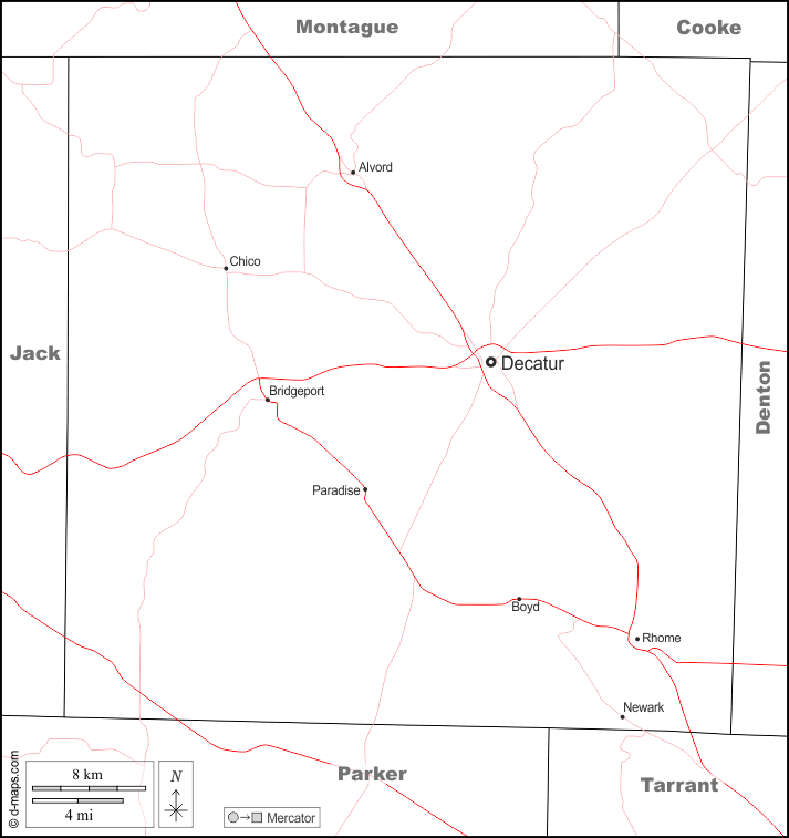 d-maps > संयुक्त राज्य > टेक्सास > समझदार काउंटी > सीमाओं, मुख्य शहरों, सड़कों, नाम, सफेद