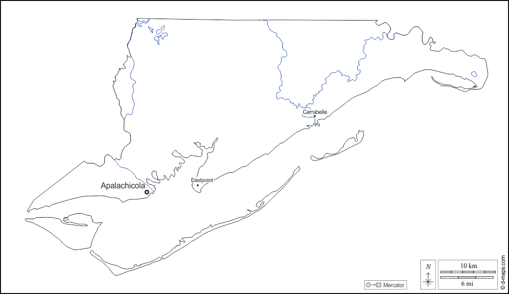 d-maps > संयुक्त राज्य > फ्लोरिडा > फ्रैंकलिन काउंटी > बाह्यरेखा, जल-सर्वेक्षण, मुख्य शहरों, नाम, सफेद