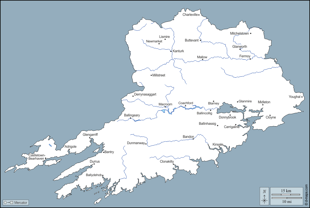 d-maps > यूरोप > आयरलैण्ड गणतंत्र > कॉर्क > बाह्यरेखा, जल-सर्वेक्षण, मुख्य शहरों, नाम
