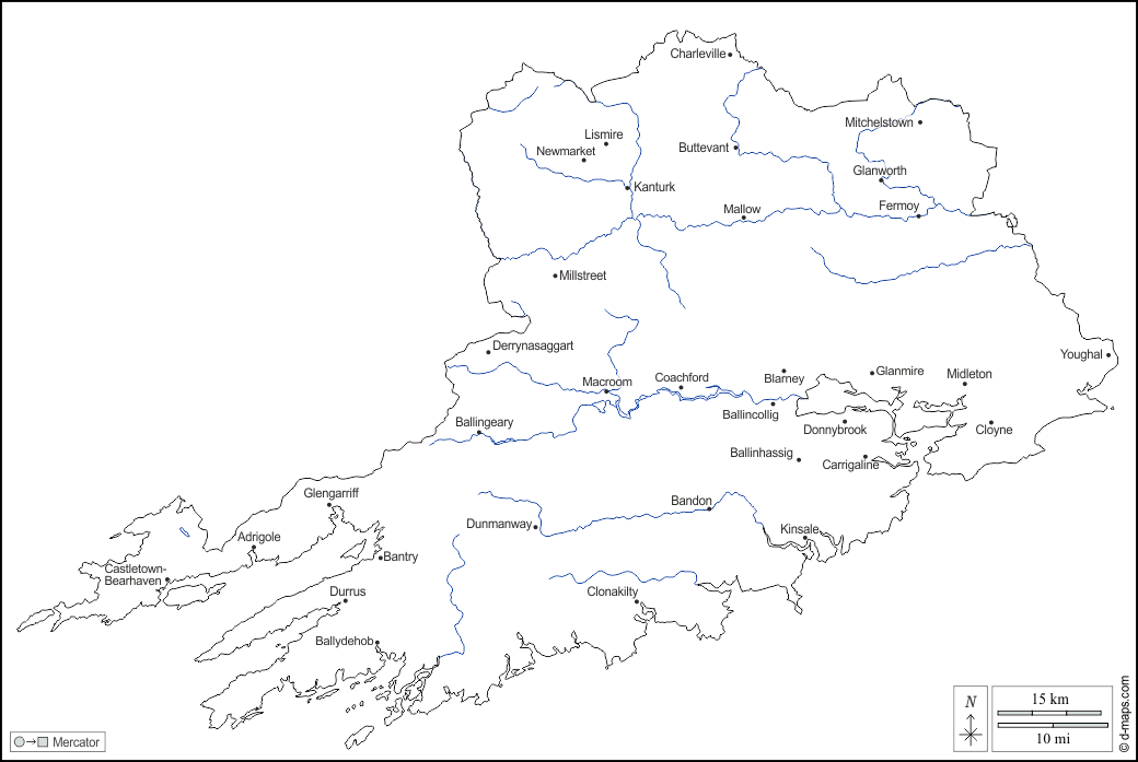 d-maps > यूरोप > आयरलैण्ड गणतंत्र > कॉर्क > बाह्यरेखा, जल-सर्वेक्षण, मुख्य शहरों, नाम, सफेद