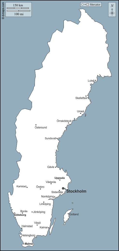 d-maps > यूरोप > स्वीडन > स्वीडन > बाह्यरेखा, मुख्य शहरों, नाम
