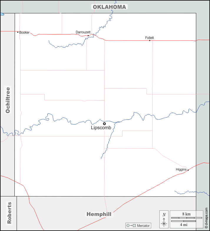 d-maps > संयुक्त राज्य > टेक्सास > लिप्सकॉम्ब काउंटी > सीमाओं, जल-सर्वेक्षण, मुख्य शहरों, सड़कों, नाम