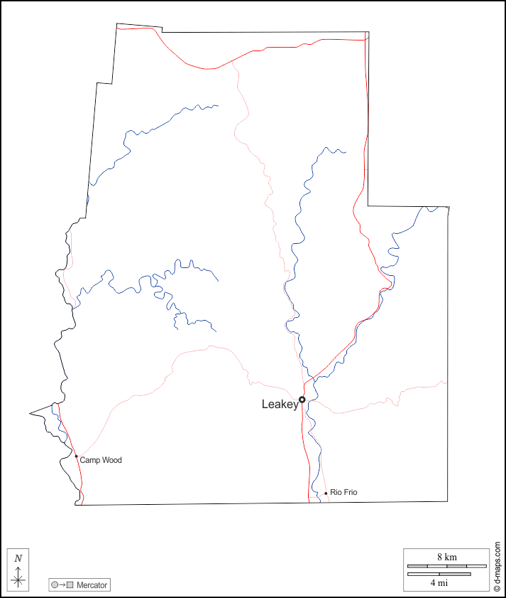 d-maps > संयुक्त राज्य > टेक्सास > रीयल काउंटी > बाह्यरेखा, जल-सर्वेक्षण, मुख्य शहरों, सड़कों, नाम, सफेद