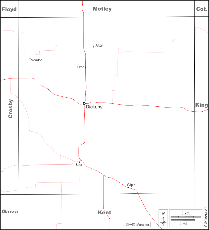 d-maps > संयुक्त राज्य > टेक्सास > डिकेंस काउंटी > सीमाओं, मुख्य शहरों, सड़कों, नाम, सफेद