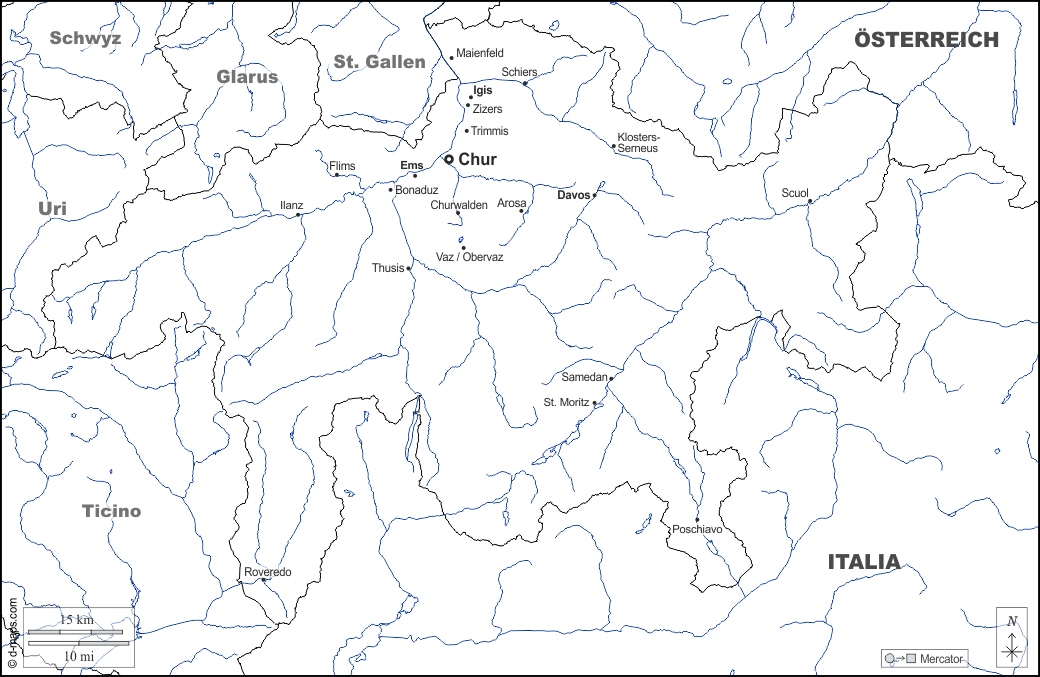d-maps > यूरोप > स्विट्ज़रलैंड > ग्राउबुन्डन कैन्टन > सीमाओं, जल-सर्वेक्षण, मुख्य शहरों, नाम, सफेद