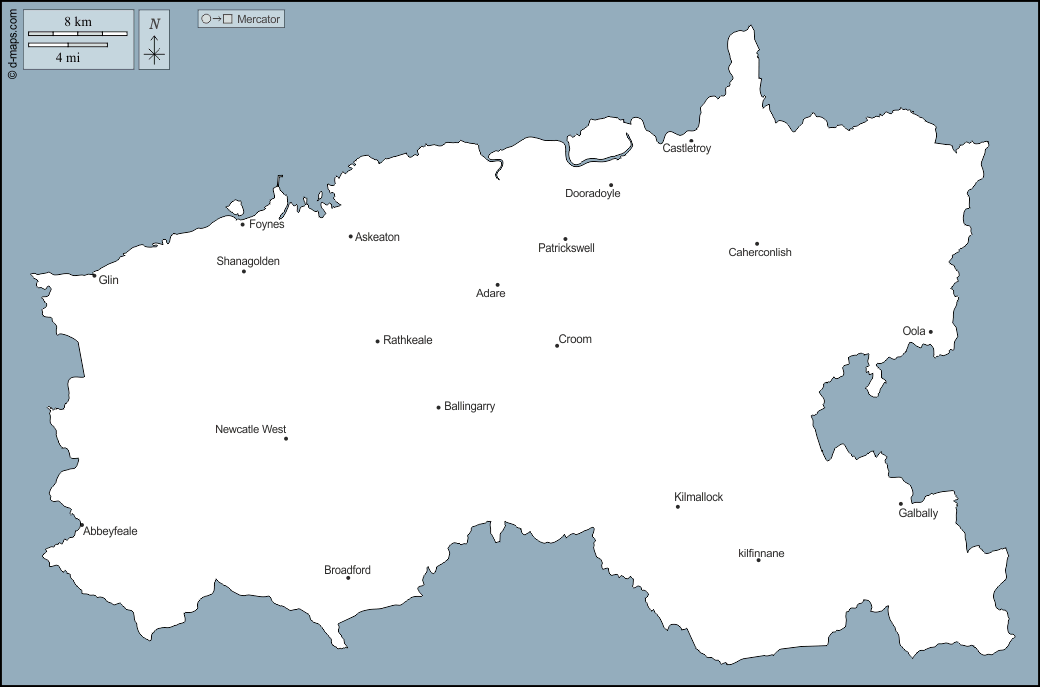 d-maps > यूरोप > आयरलैण्ड गणतंत्र > लिमरिक > बाह्यरेखा, मुख्य शहरों, नाम