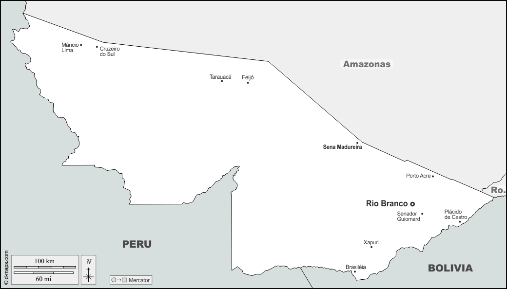 d-maps > महाअमेरिका > ब्राज़ील > एकड़ की स्थिति > सीमाओं, मुख्य शहरों, नाम