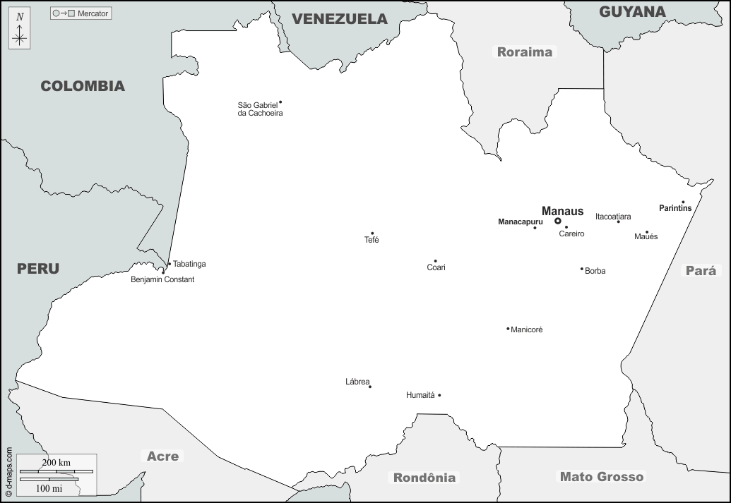 d-maps > महाअमेरिका > ब्राज़ील > अमेज़ोनस राज्य > सीमाओं, मुख्य शहरों, नाम
