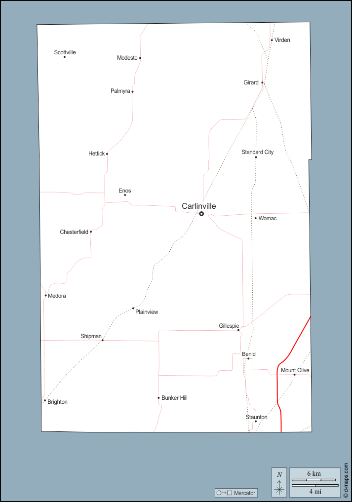 Benld - Brighton - Bunker Hill - Carlinville - Chesterfield - Enos - Gillespie - Girard - Hettick - Medora - Modesto - Mount Olive - Palmyra - Plainview - Scottville - Shipman - Standard City - Staunton - Virden - Womac