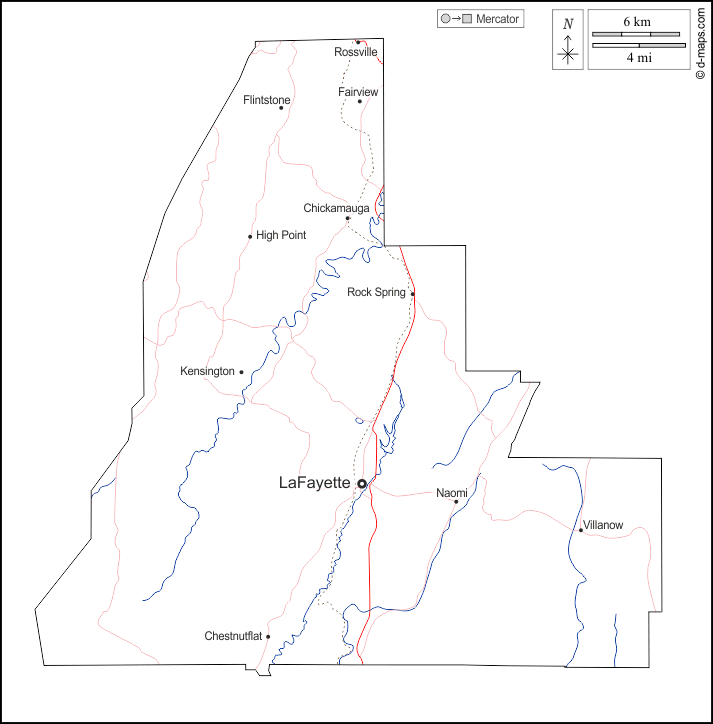 d-maps > संयुक्त राज्य > जॉर्जिया > वॉकर काउंटी > बाह्यरेखा, जल-सर्वेक्षण, मुख्य शहरों, सड़कों, नाम, सफेद