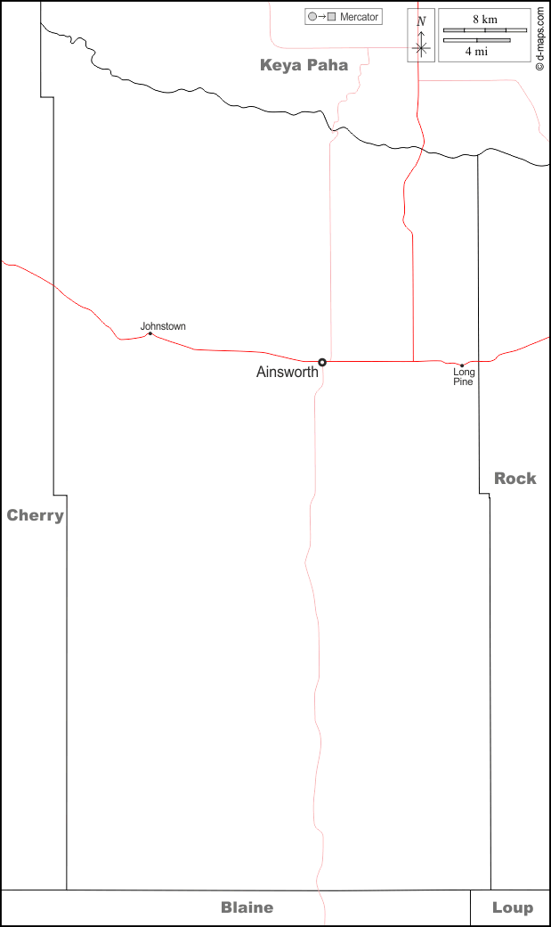 d-maps > संयुक्त राज्य > नेब्रास्का > ब्राउन काउंटी > सीमाओं, मुख्य शहरों, सड़कों, नाम, सफेद