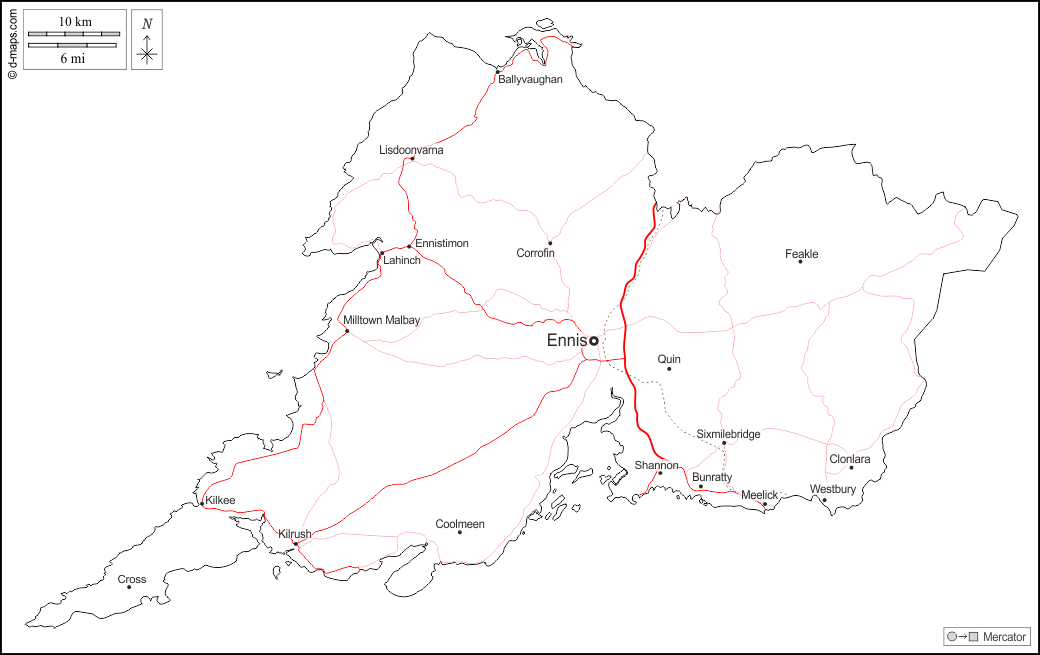 d-maps > यूरोप > आयरलैण्ड गणतंत्र > क्लेयर > बाह्यरेखा, मुख्य शहरों, सड़कों, नाम, सफेद