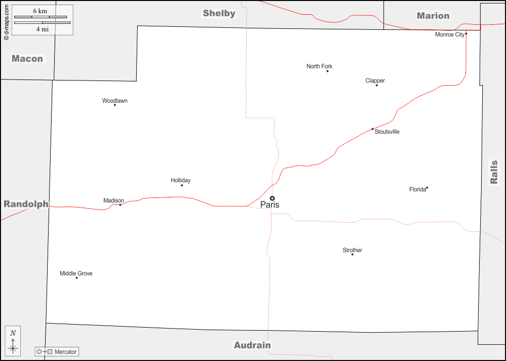 d-maps > संयुक्त राज्य > मिज़ूरी > मोनरो काउंटी > सीमाओं, मुख्य शहरों, सड़कों, नाम