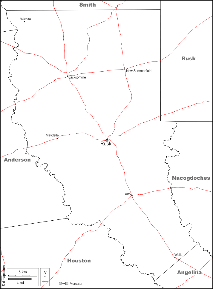 d-maps > संयुक्त राज्य > टेक्सास > चेरोकी काउंटी > सीमाओं, मुख्य शहरों, सड़कों, नाम, सफेद