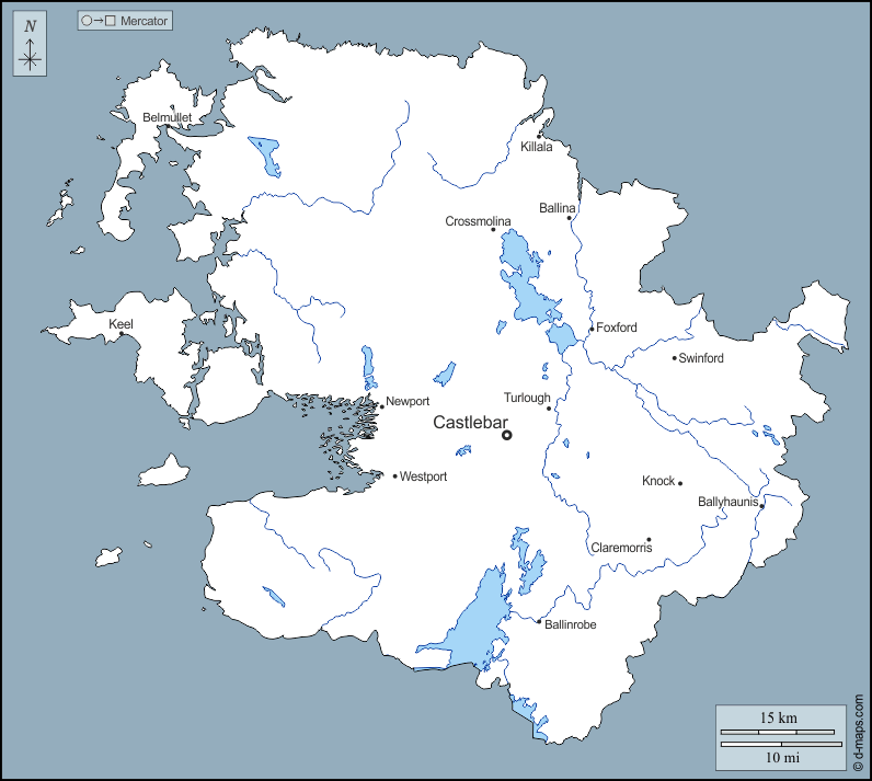 d-maps > यूरोप > आयरलैण्ड गणतंत्र > मेयो > बाह्यरेखा, जल-सर्वेक्षण, मुख्य शहरों, नाम