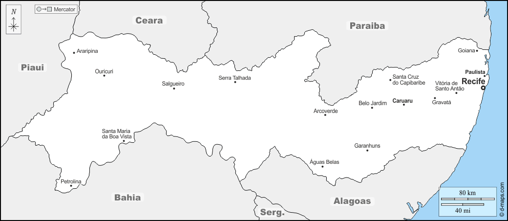 d-maps > महाअमेरिका > ब्राज़ील > पेरनाम्बुको राज्य > सीमाओं, मुख्य शहरों, नाम