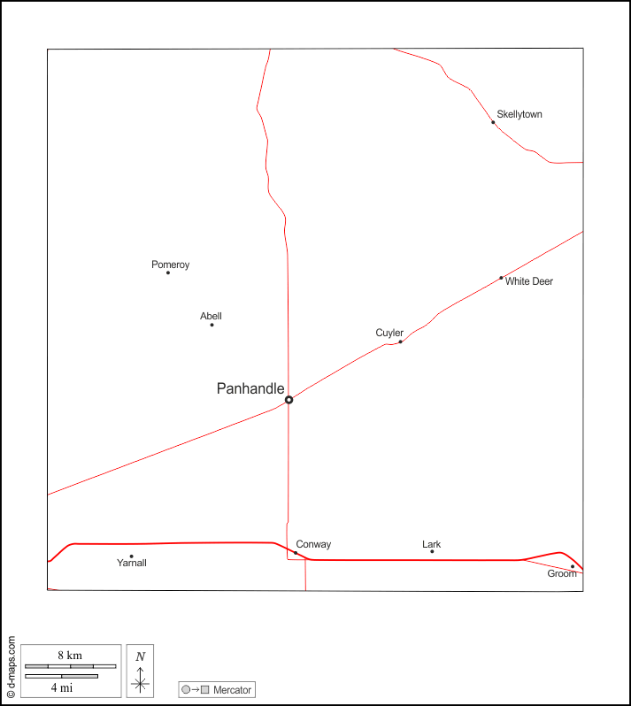 d-maps > संयुक्त राज्य > टेक्सास > कार्सन काउंटी > बाह्यरेखा, मुख्य शहरों, सड़कों, नाम, सफेद