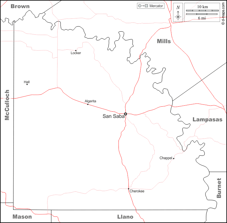 d-maps > संयुक्त राज्य > टेक्सास > सैन सबा काउंटी > सीमाओं, मुख्य शहरों, सड़कों, नाम, सफेद