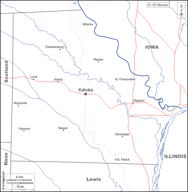 d-maps > संयुक्त राज्य > मिज़ूरी > क्लार्क काउंटी > सीमाओं, जल-सर्वेक्षण, मुख्य शहरों, सड़कों, नाम, सफेद