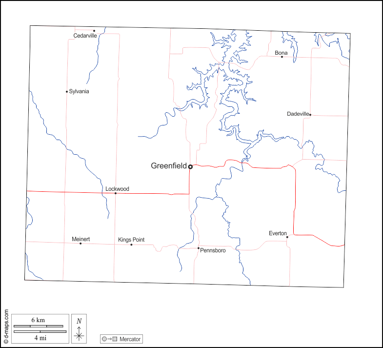 d-maps > संयुक्त राज्य > मिज़ूरी > डेड काउंटी > बाह्यरेखा, जल-सर्वेक्षण, मुख्य शहरों, सड़कों, नाम, सफेद