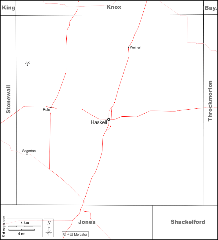 d-maps > संयुक्त राज्य > टेक्सास > हास्केल काउंटी > सीमाओं, मुख्य शहरों, सड़कों, नाम, सफेद